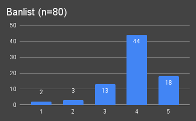 The banlist also scores very strongly, though with a slightly wider spread of opinions than the overall format score. The community rating came in at a 3,91 mean with a median of 4, and 77,50 % of respondents rated the banlist 4–5 (with 22,50 % giving a perfect 5). Importantly, the open feedback does not show a single, widely shared demand to move the banlist in a specific direction; instead, comments tend to reflect philosophy. Some players would like a bit more experimentation over time, while others prefer minimal change because the current environment feels stable.
