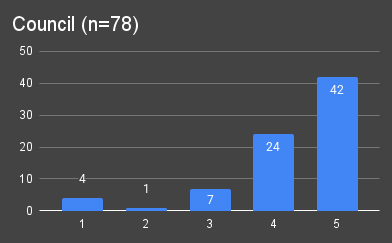 Community confidence in the council’s work is strong. This question scored a 4,27 mean with a median of 5, and 84,62 % of respondents rated the council 4–5, including a majority of 53,85 % perfect 5s. Even where people disagree with specific decisions or would prefer a different tuning philosophy, the dominant tone in comments is appreciation for the overall direction and for clear communication.